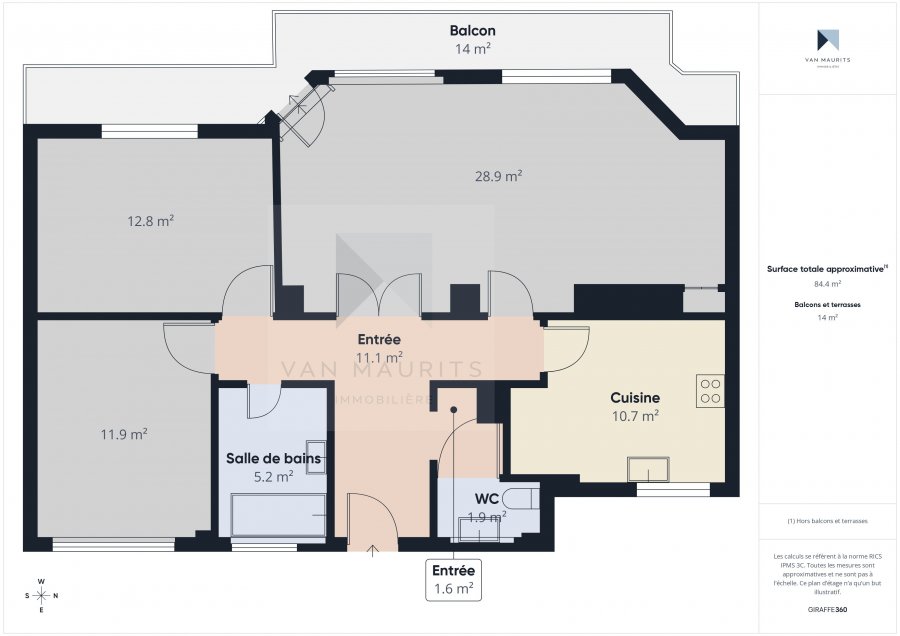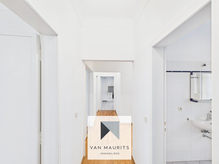 L'appartement se compose comme suit: Un hall d'entrée de ±7m² avec vestiaire ; Un couloir de ±11m²; Un salon de ±31m² ; une cuisine de ±11m² avec espace buanderie ; Deux chambres de ±13 et 13m² ; Une salle de bain de ±5m² avec baignoire et lavabo ; 1 toilette séparée.