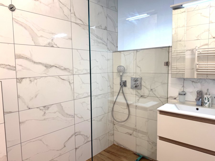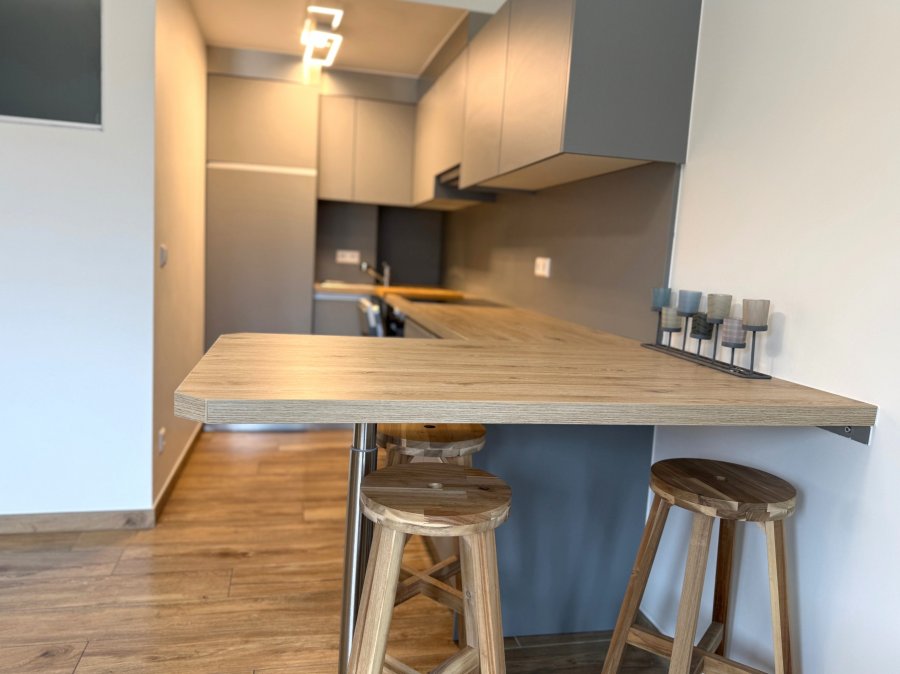 Il se compose d'une entrée ouvrant sur un séjour lumineux de 21m2 avec un canapé convertible, d'une cuisine ouverte et équipée de 4m2, d'une chambre de 13m2 avec placards intégrés et d'une salle de douche avec lavabo et WC.