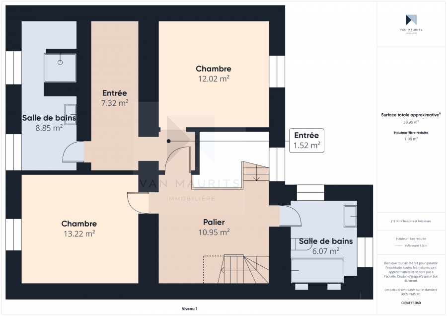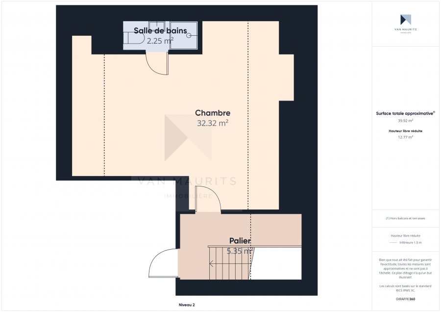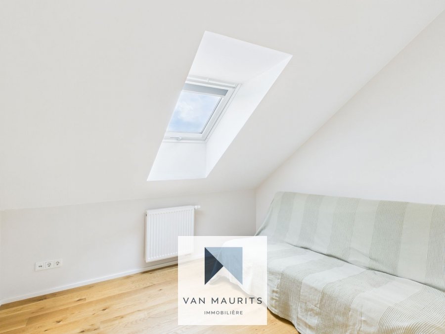 Au deuxième étage, comblé un palier de ± 5 m² mène à un bureau de ± 12 m² et à une chambre de ± 32 m² avec une salle de douche de ± 2 m².