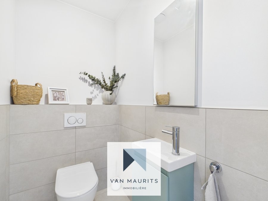 Le 1ier étage, comprend un hall d'entrée de ± 5 m² qui dessert un wc séparé de ± 2 m² (wc, lave mains) ainsi que le séjour de ± 50 m² qui donne sur une cuisine contemporaine de ± 15 m², équipée et aménagée avec un débarras de ± 5 m² et l'accès à une terrasse de ± 15 m².