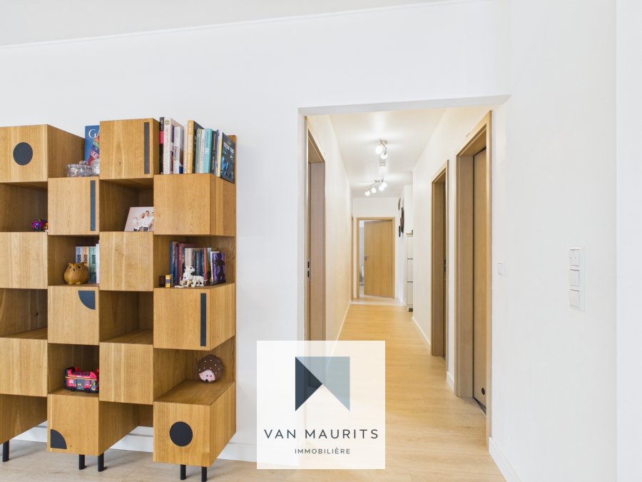 Au troisième étage, l'appartement s'ouvre sur un hall d'entrée desservant un spacieux séjour de ± 36 m² avec sa cuisine équipée et ouverte, offrant un espace de vie lumineux et convivial. Un couloir de ± 10m2 mène à l'espace nuit qui comprend trois chambres de ± 9 m² (pouvant servir de bureau), 14 m² et 10 m². Une salle de douche moderne de ± 6 m², équipée d'une douche à l'italienne, d'une vasque, d'un WC et d'un sèche-serviettes. Un débarras de ± 3 m² apporte un espace de rangement supplémentaire.