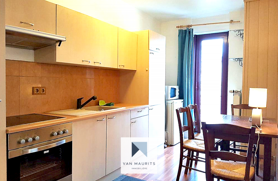 Un hall d'entrée de ± 3,5 m² dessert l'espace de vie, comprenant une cuisine ouverte, équipée et aménagée de ± 9 m², un séjour de ± 12 m², une chambre de ± 9 m², ainsi qu'une salle de bains de ± 3.2 m² équipée d'une douche, d'un lavabo et de WC.