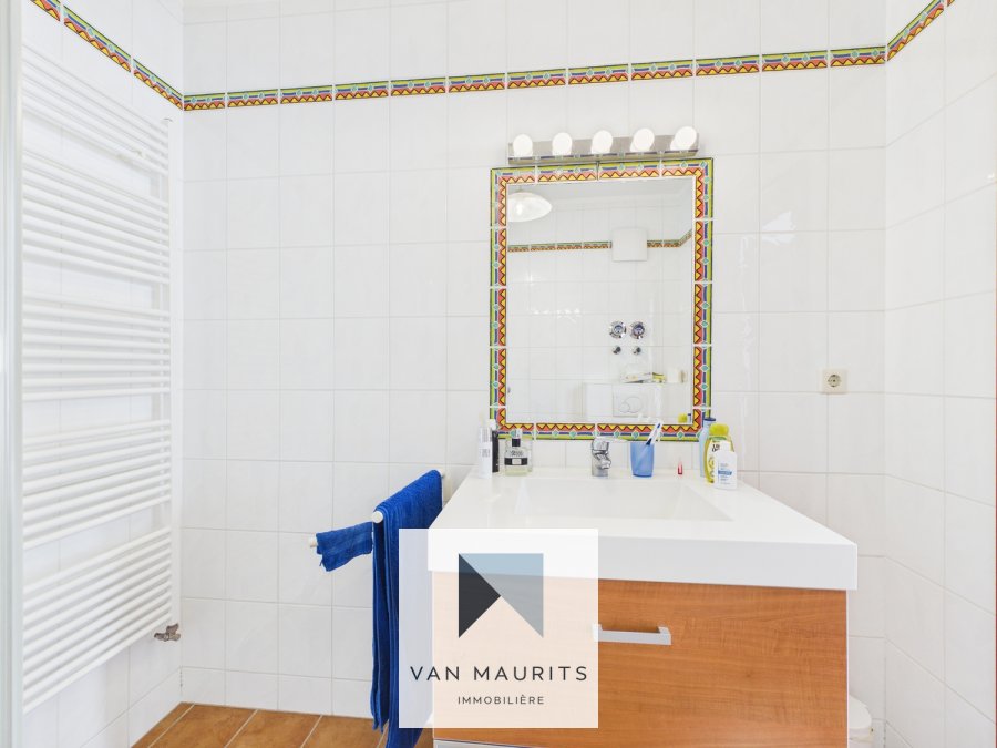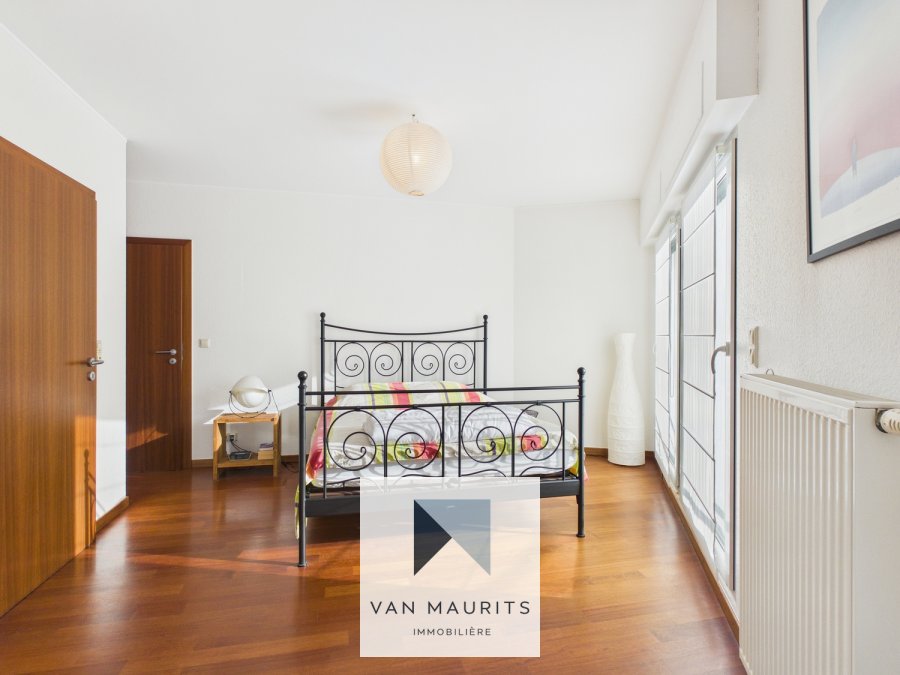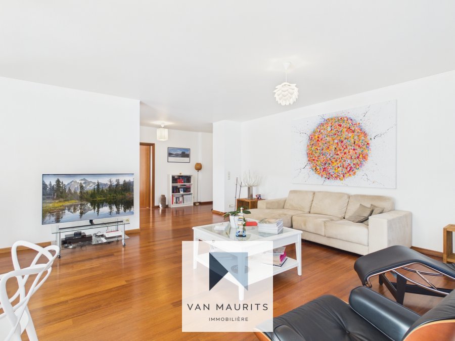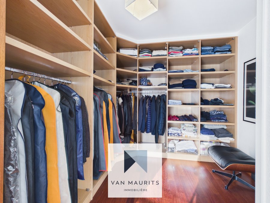 La porte d'entrée s'ouvre sur un hall de ± 6 m² desservant le lumineux et spacieux séjour avec parquet massif de ± 55 m² donnant accès à un balcon de ± 10 m², une cuisine ouverte équipée et aménagée donnant également accès à un balcon de ± 2.5 m², une spacieuse chambre de ± 18 m² avec deux dressings de ± 7.5 m² et ± 1.5 m² et une salle de bains attenante de ± 5 m².Un escalier mène à l'étage et donne sur un hall de nuit de ± 3 m² desservant trois chambres de ± 10 m², ± 10,5 m² et ± 17,5 m², toutes donnant accès à une belle terrasse de ± 41 m² faisant le tour de l'appartement, ainsi qu'à une salle de bains de ± 5 m².