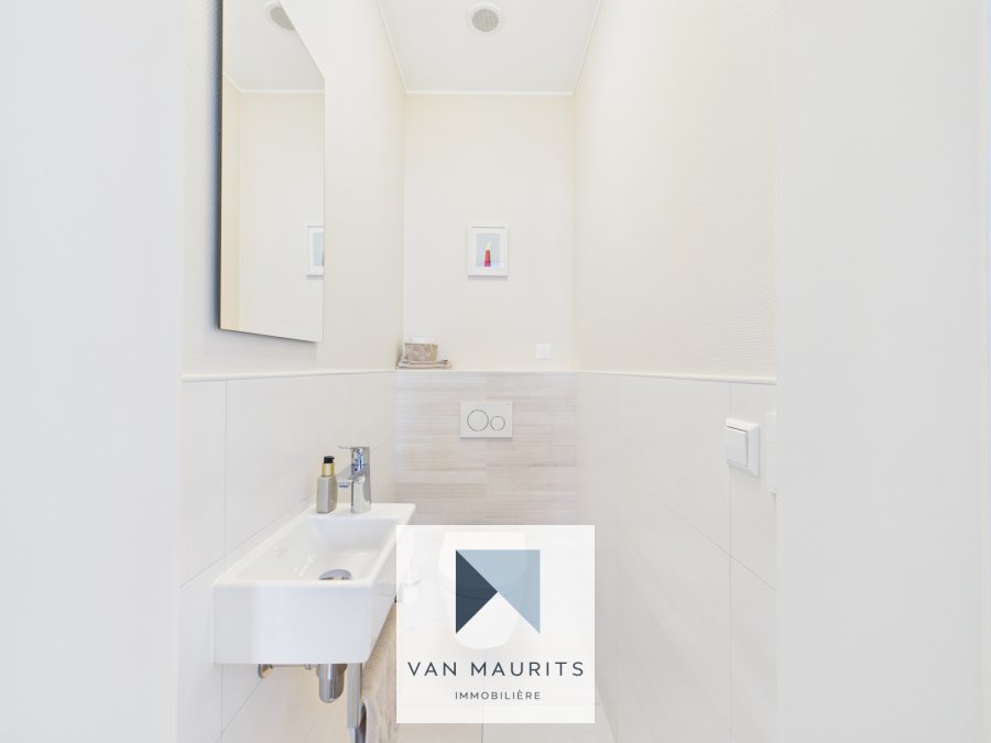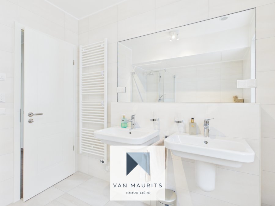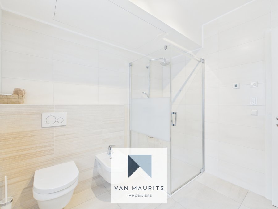 La salle de bain d'environ ±7 m² est entièrement équipée avec une douche, un WC, un bidet, un double lavabo ainsi qu'un sèche-serviettes. Un WC séparé de ±1 m² complète l'ensemble.
