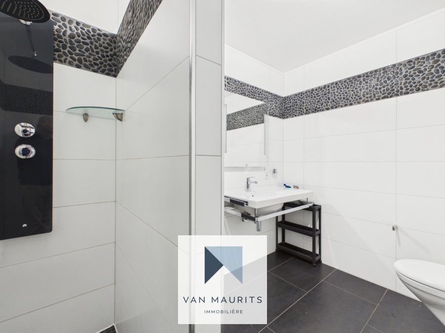 La chambre à coucher (17 m²) bénéficie d'une belle surface et permet un aménagement confortable. La salle de bains avec WC (6 m²), au style contemporain, est équipée d'une douche à l'italienne. Un débarras privatif à l'intérieur même de l'appartement (5 m²) vient compléter l'ensemble en apportant un espace de rangement particulièrement appréciable.