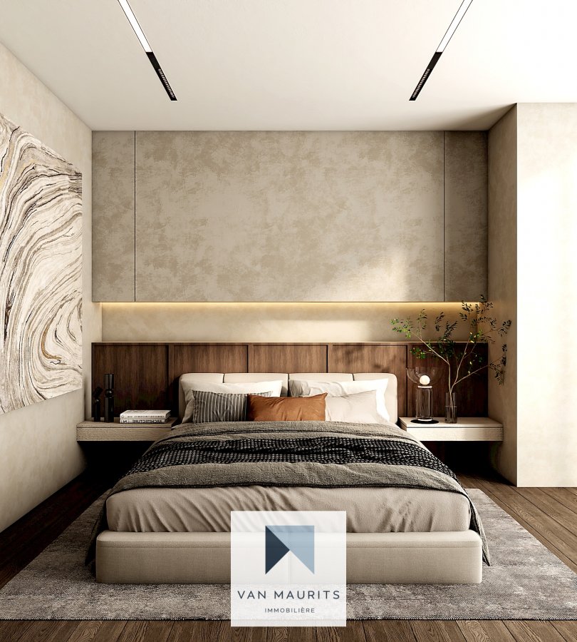 The sleeping area comprises two bedrooms, one of ± 15 m² with its own en-suite shower room of ± 3 m², and the other bedroom of ± 12 m², as well as a bathroom of ± 5 m², a storage room of ± 2 m², and a separate WC of ± 2 m².