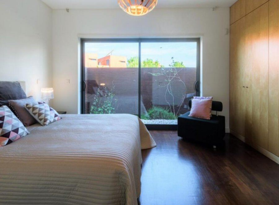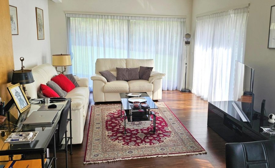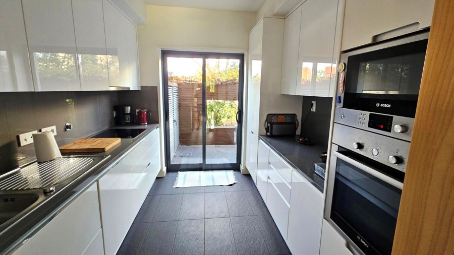 Au rez-de-jardin : d'une entrée de ± 7m² s'ouvre sur le séjour de ± 29m² avec ces baies vitrées donnant sur la terrasse de 21m² et les jardins paysagés. La cuisine équipée de ± 8m² donne sur un patio à l'arrière idéal pour le barbecue ; un petit couloir mène vers la chambre en suite de ± 18m² avec son dressing intégré et sa salle de douche de ± 6m² ; un WC séparé.