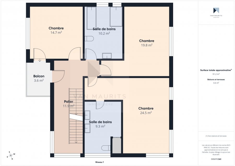 Au 1er étage, un palier de ± 13 m² dessert trois chambres de ± 15 (avec un balcon), 20 et 24 m² et deux salles de bains, chacune de ± 10 m² (baignoire, douche, lavabo, wc).