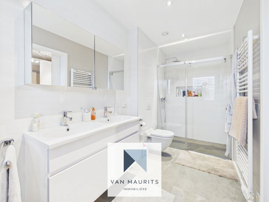 Le premier étage: d'un palier de ± 15 m²; d'une chambre parentale de ± 14 m² avec dressing de ± 9 m² et salle de douche de ± 9 m²; de deux chambres de ± 16 et 17 m²; d'une salle de douche de ± 10 m².