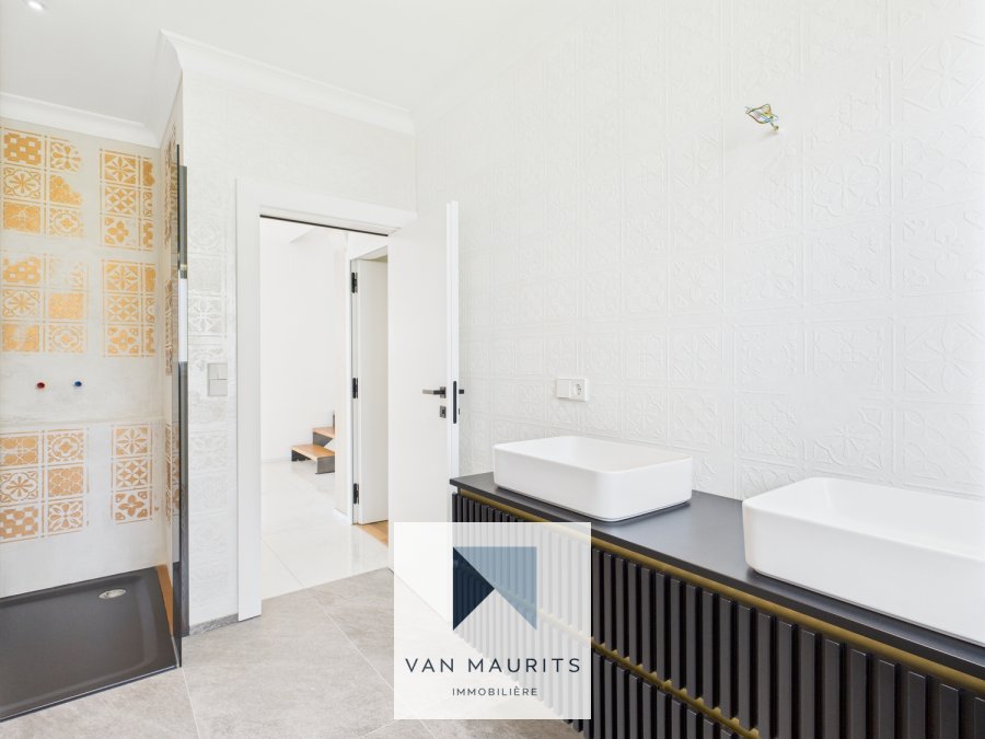 The landing leads to two large bedrooms of ±37 m² and ±25 m², each with its private shower room. A pre-installation for a whirlpool bathtub exists in the larger bedroom.