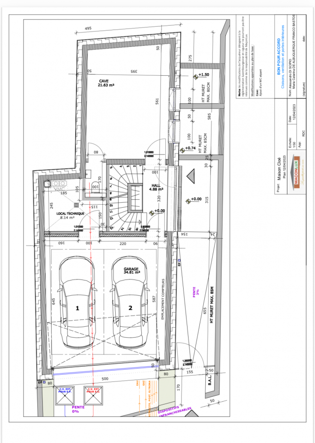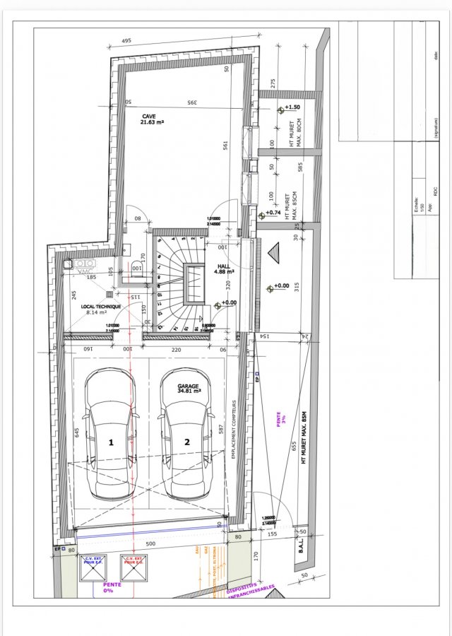 Au rez-de-chaussée, le hall d'entrée de ± 5 m² dessert un garage de ± 35 m², un local technique de ± 8 m² ainsi qu'une salle multifonctionnelle de ± 22 m² pouvant servir de bureau, salle de loisirs ou chambre d'appoint. Ce niveau comprend également un hall de ± 5 m² et un wc séparé de ± 2 m².