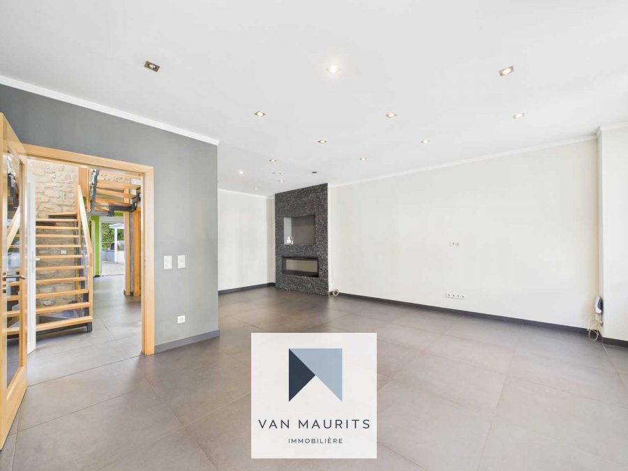 Au rez-de-chaussée : d'une entrée de ± 8m² donnant d'un côté accès au séjour / salle à manger de ± 29m² avec sa cheminée électrique. De l'autre côté, une salle d'eau avec douche et WC, et la cuisine entièrement équipée de ± 19m² avec son îlot central et donnant sur un grand espace terrasse semi-couverte de ± 50m² avec son four à pizza/barbecue.